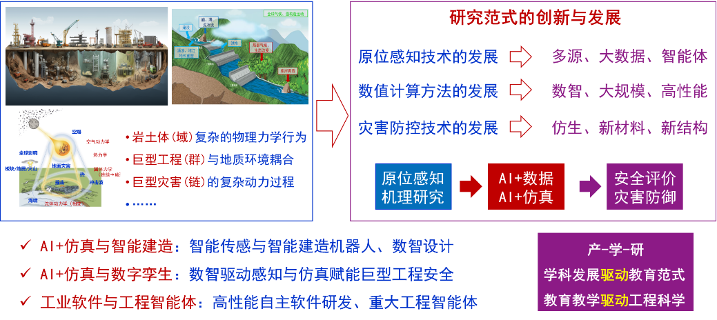 围绕数智岩土工程,在高性能数值算法与工程软件、人工智能与工程安全、自动化与智能建造、岩土工程行业大模型与生成式设计、巨型工程与灾害防御等方面深入学习和研究;探讨数据驱动及AI赋能工程/科学研究范式助力巨型工程安全与灾害防御。